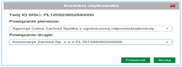 W przypadku gdy wniosek składany jest np. przez upoważnioną Agencję Celną należy ustawić kontekst w zakresie dwóch poziomów. Pierwszy to kontekst dot. Agencji Celnej a drugi dot. podmiotu, który upoważnił Agencję do składania wniosków w swoim imieniu.