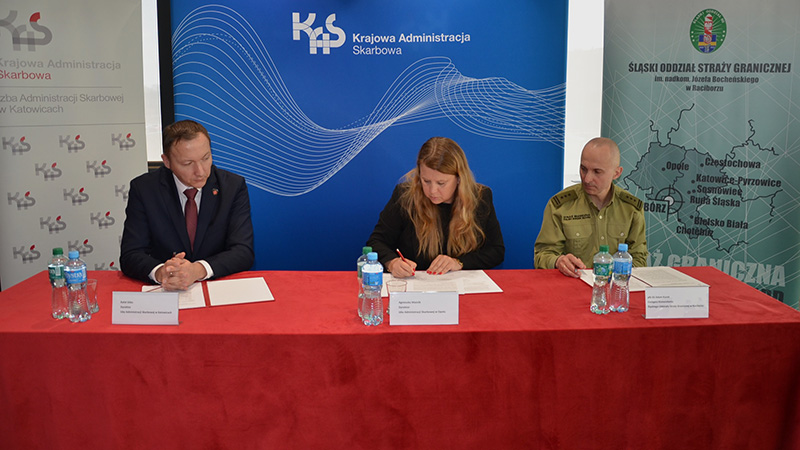 Wczoraj, 23 marca 2026 r. w Izbie Administracji Skarbowej w Opolu odbyło się spotkanie przedstawicieli izb administracji skarbowej w Opolu i w Katowicach oraz Śląskiego Oddziału Straży Granicznej w Raciborzu.