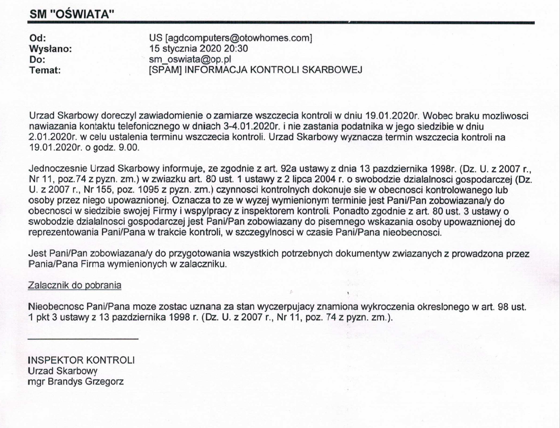 Ostrzegamy przed fałszywymi e-mailami, w których autor wiadomości podszywa się pod pracownika Urzędu Skarbowego i informuje o nadchodzącej kontroli.